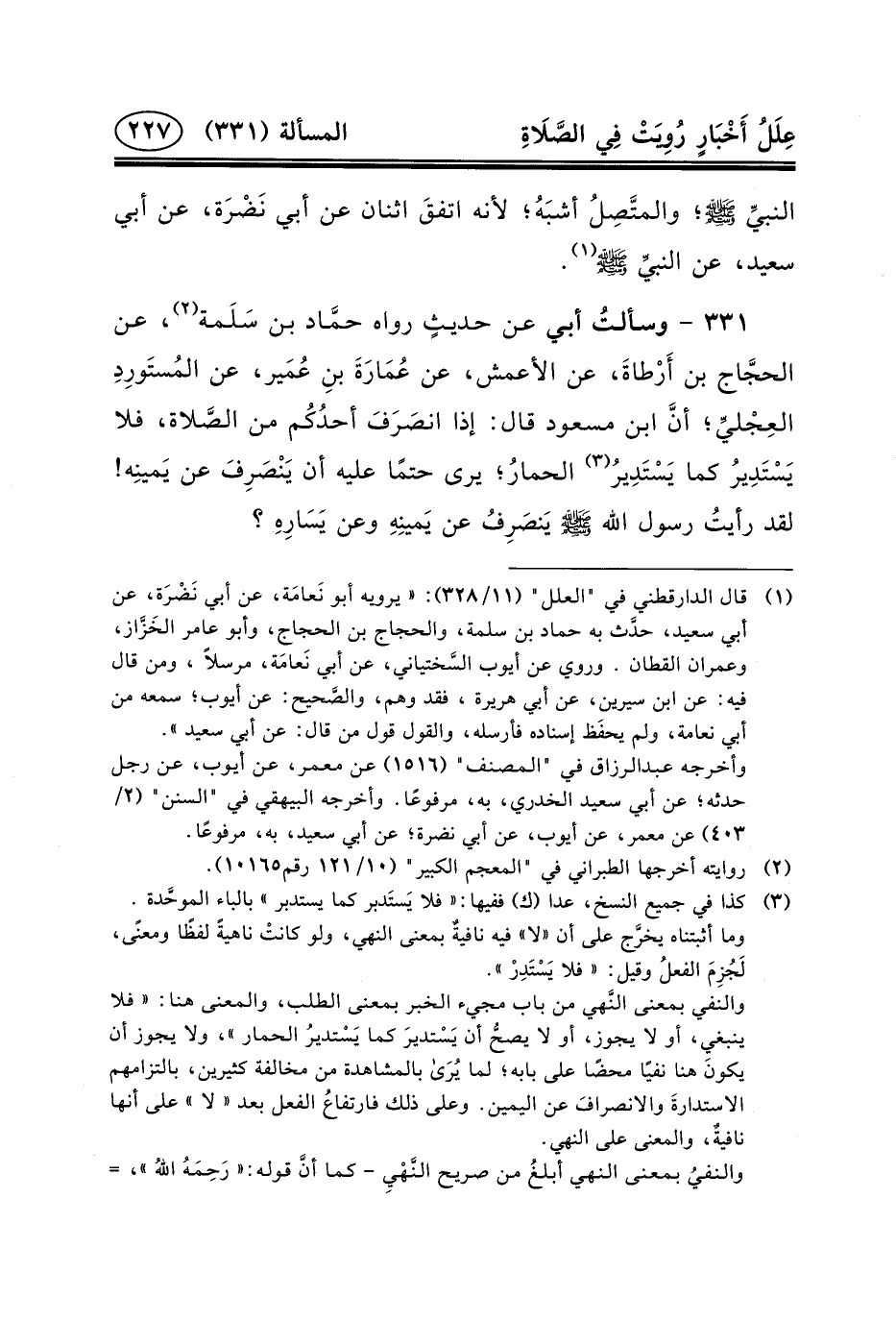 ٣٣١ - وسألتُ أَبِي عَنْ حديثٍ رَوَاهُ حمَّاد ابن سَلَمة (٢) ، عَنِ الحجَّاج بْنِ أَرْطاةَ، عَنِ الأَعْمَشِ، عَنْ عُمَارَةَ بنِ عُمَير، عَنِ المُستَورِدِ العِجْليِّ؛ أنَّ ابْنَ مَسْعُودٍ قَالَ: إِذَا انصَرَفَ أحدُكُم مِنَ الصَّلاة، فَلا يَسْتَدِيرُ كَمَا يَسْتَدِيرُ (٣)