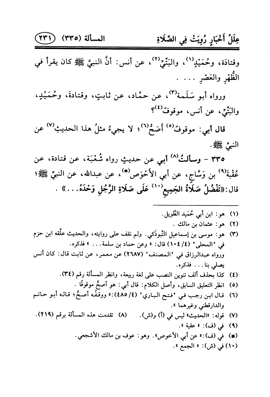 ٣٣٥ - وسألتُ (٨) أَبِي عَنْ حديثٍ رَوَاهُ شُعْبَة، عَنْ قَتَادَةَ، عَنْ عُقْبةَ (٩) بْنِ وَسَّاجٍ، عَنْ أَبِي الأَحْوَص (*) ، عن عبد الله، عن النبيِّ (ص) ؛ قَالَ: تَفْضُلُ صَلَاةُ الجَمِيعِ (١٠) عَلَى صَلَاةِ الرَّجُلِ وَحْدَهُ ... .