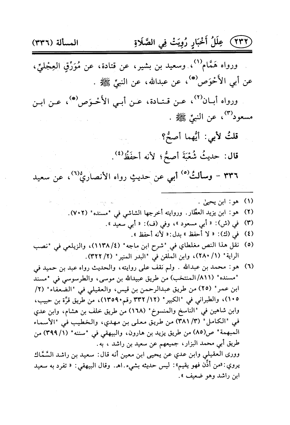 وَرَوَاهُ هَمَّام (١) ، وَسَعِيدُ بْنُ بَشِيرٍ، عَنْ قَتَادَةَ، عَنْ مُوَرِّقٍ العِجْليِّ، عن أبي الأَحْوَص (*) ، عن عبد الله، عن النبيِّ (ص) .