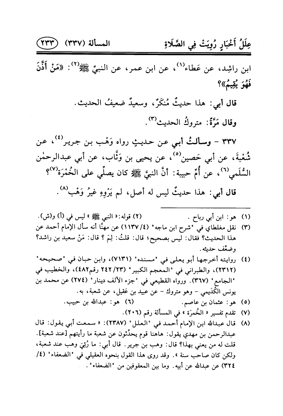 ٣٣٧ - وسألتُ أَبِي عَنْ حديثٍ رواه وَهْب ابن جَرِيرٍ (٤) ، عَنْ شُعْبةَ، عَنْ أَبِي حَصين (٥) ، عَنْ يَحْيَى بْنِ وَثَّاب، عن أبي عبد الرحمن السُّلَمي (٦) ، عَنْ أُمِّ حَبِيبَةَ: أنَّ النبيَّ (ص) كَانَ يصلِّي عَلَى الخُمْرَة (٧) ؟