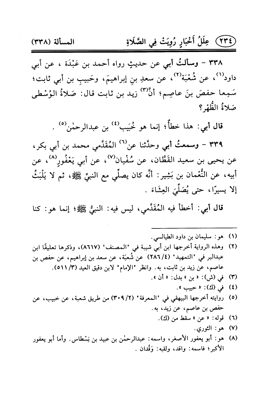 ٣٣٨ - وسألتُ أَبِي عَنْ حديثٍ رَوَاهُ أحمد ابن عَبْدَة، عَنْ أَبِي دَاوُدَ (١) ، عَنْ شُعْبَة (٢) ، عَنْ سعدِ بنِ إبراهيمَ، وحَبيبِ بْن أَبِي ثابت؛ سَمِعا حفصَ بنَ عاصِم؛ أنَّ (٣) زيد بْن ثابت قَالَ: صَلاةُ الوُسْطى صَلاةُ الظُّهْر؟