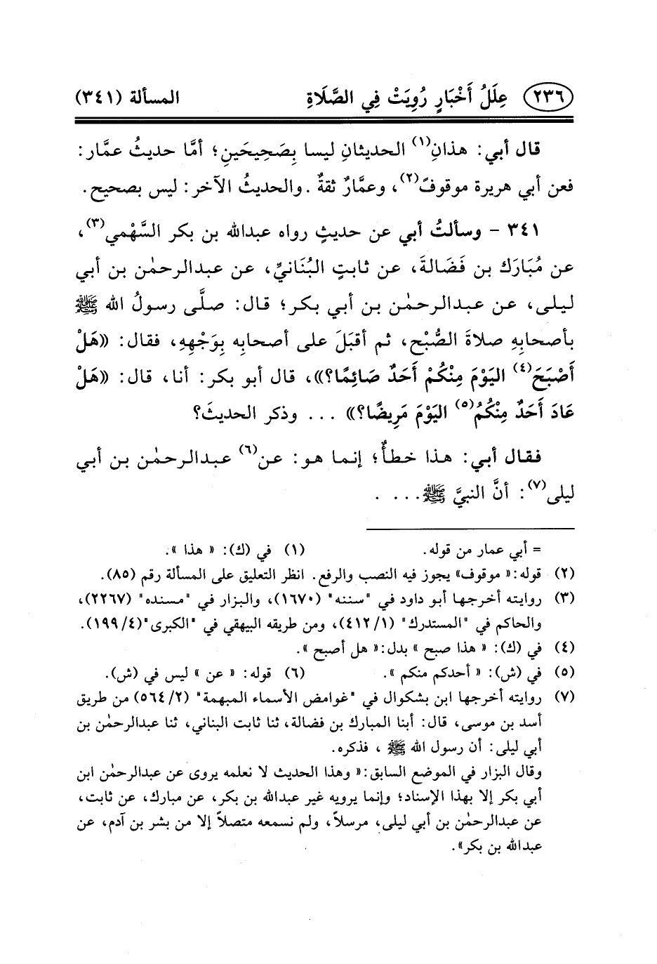 ٣٤١ - وسألتُ أبي عن حديثٍ رواه عبد الله بْنُ بَكْر السَّهْمي (٣) ، عَن مُبَارَك بْن فَضَالةَ، عَن ثابتٍ البُنَانيِّ، عن عبد الرحمن بن أبي ليلى، عن عبد الرحمن بْنِ أَبِي بَكْرٍ؛ قَالَ: صلَّى رسولُ الله (ص) بأصحابِهِ صلاةَ الصُّبْح، ثُمَّ أقبَلَ عَلَى أصحابِه بِوَجْهِهِ، فَقَالَ: هَلْ أَصْبَحَ (٤) اليَوْمَ مِنْكُمْ أَحَدٌ صَائِمًا؟ ، قَالَ أَبُو بَكْر: أَنَا، قَالَ: هَلْ عَادَ أَحَدٌ مِنْكُمُ (٥) اليَوْمَ مَرِيضًا؟ ... وَذَكَرَ الحديثَ؟