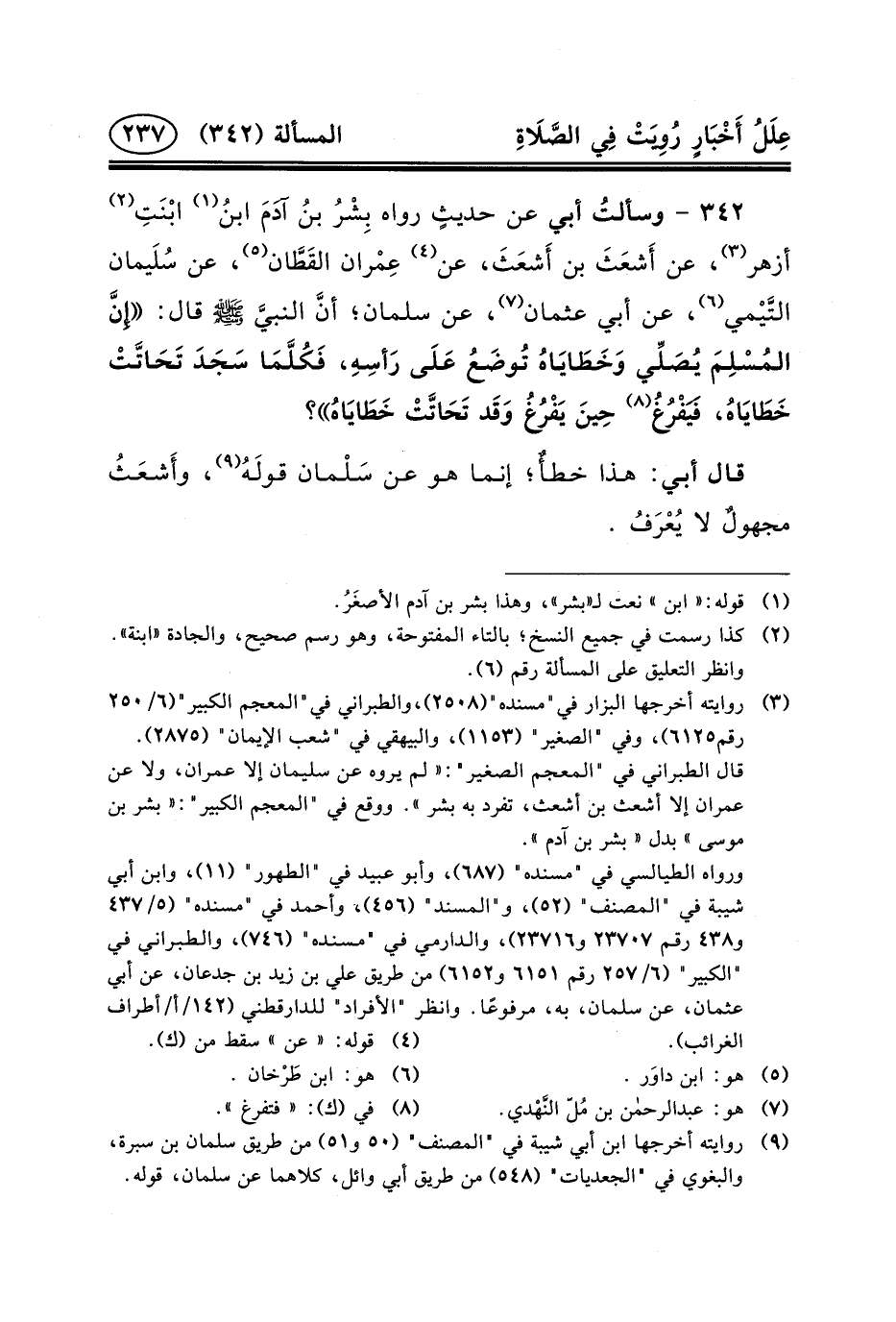 عَنْ أَشعَثَ بْنِ أَشعَثَ، عَنْ (٤) عِمْران القَطَّان (٥) ، عَنْ سُلَيمان التَّيْمي (٦) ، عَنْ أَبِي عُثْمَانَ (٧) ، عَنْ سلمان؛ أنَّ النبيَّ (ص) قَالَ: إِنَّ المُسْلِمَ يُصَلِّي وَخَطَايَاهُ تُوضَعُ عَلَى رَأسِهِ، فَكُلَّمَا سَجَدَ تَحَاتَّتْ خَطَايَاهُ، فَيَفْرُغُ (٨) حِينَ يَفْرُغُ وَقَد تَحَاتَّتْ خَطَايَاهُ؟