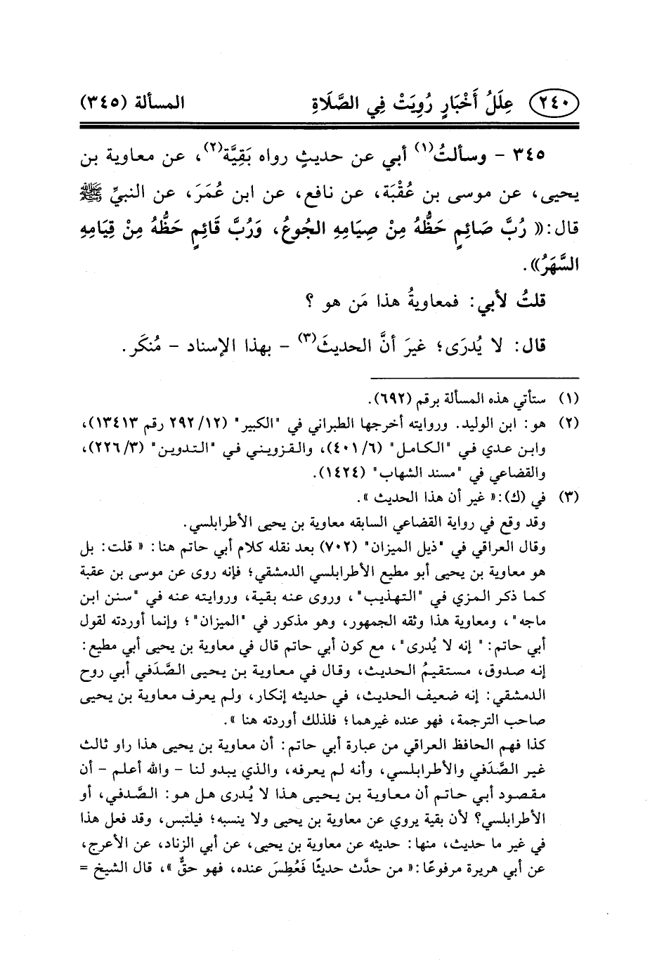 ٣٤٥ - وسألتُ (١) أَبِي عَنْ حديثٍ رَوَاهُ بَقِيَّة (٢) ، عَنْ مُعَاوِيَةَ بْنِ يَحْيَى، عَنْ مُوسَى بْنِ عُقْبَة، عَنْ نَافِعٍ، عَنِ ابْنِ عُمَرَ، عَنْ النبيِّ (ص) قَالَ: رُبَّ صَائِمٍ حَظُّهُ مِنْ صِيَامِهِ الجُوعُ، وَرُبَّ قَائِمٍ حَظُّهُ مِنْ قِيَامِهِ السَّهَرُ.