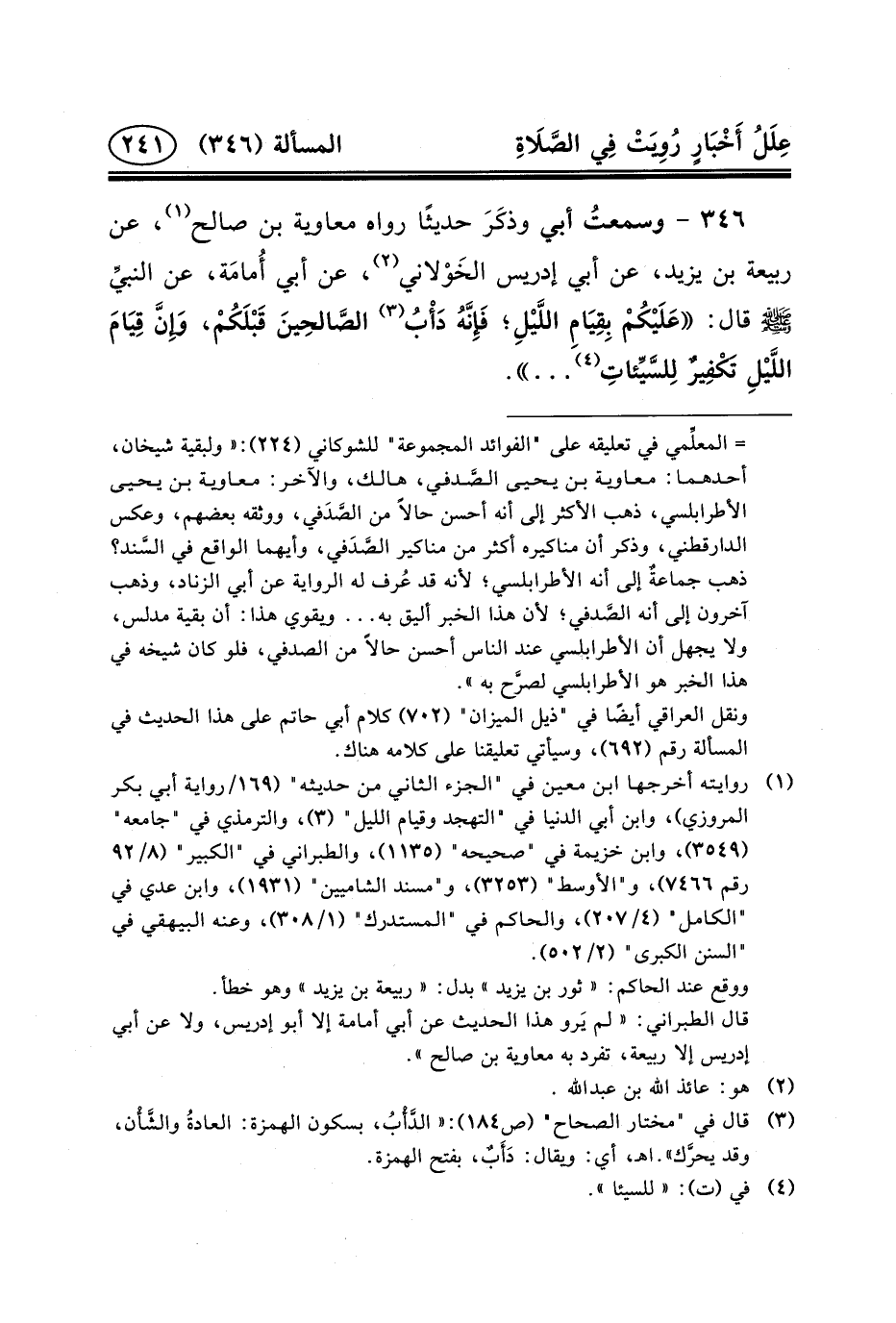 ٣٤٦ - وسمعتُ أَبِي وذكَرَ حَدِيثًا رَوَاهُ مُعَاوِيَةُ بْن صَالِحٍ (١) ، عَنْ رَبِيعَةَ بْنِ يَزِيدَ، عَنْ أَبِي إِدْرِيسَ الخَوْلاني (٢) ، عَنْ أَبِي أُمامَة، عَنِ النبيِّ (ص) قَالَ: عَلَيْكُمْ بِقِيَامِ اللَّيْلِ؛ فَإِنَّهُ دَأْبُ (٣) الصَّالحِينَ قَبْلَكُمْ، وَإِنَّ قِيَامَ اللَّيْلِ تَكْفِيرٌ لِلسَّيِّئاتِ (٤) ... .
