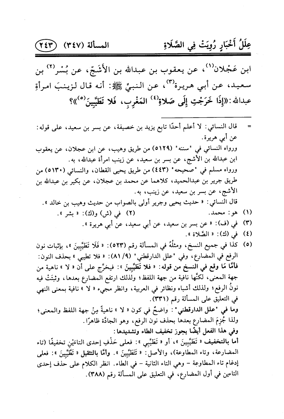 (٥) كذا في جميع النسخ، ومثلُهُ في المسألة رقم (٥٢٣) : «فَلَا تَطَيَّبِينَ» ، بإثبات نون الرفع في المضارع، وفي "علل الدارقطني" (٩/٨١) : «فلا تطيبي» بحذف النون: