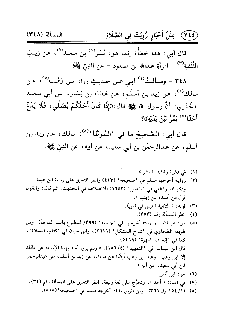 ٣٤٨ - وسألتُ (٤) أَبِي عَنْ حديثٍ رَوَاهُ ابْنُ وَهْب (٥) ، عَنْ مَالِكٍ (٦) ، عَنْ زَيْدِ بْنِ أسلَم، عَنْ عَطَاء بْنِ يَسَار، عَنْ أَبِي سَعِيدٍ الخُدْري: أنَّ رسولَ الله (ص) قَالَ: إِذَا كَانَ أَحَدُكُمْ يُصَلِّي، فَلَا يَدَعْ أَحَدًا (٧) يَمُرُّ بَيْنَ يَدَيْهِ؟