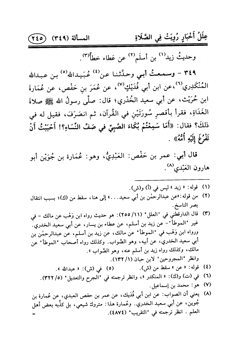 ٣٤٩ - وسمعتُ أَبِي وحدَّثنا عن (٤) عُبَيدالله (٥) بن عبد الله المُنْكَدِري (٦) ، عَنِ ابْنِ أَبِي فُدَيْكٍ (٧) ، عَنْ عُمَرَ بنِ حَفْص، عَنْ عُمَارةَ بْنِ حُرَيْث، عَنْ أَبِي سَعِيدٍ الخُدْري؛ قَالَ: صلَّى رسولُ اللَّهِ (ص) صلاةَ الغَدَاةِ، فَقَرَأَ بأقصرِ سُورَتَيْنِ فِي القُرآن، ثُمَّ انصَرَفَ، فَقِيلَ لَهُ فِي ذلكَ؟ فَقَالَ: أَمَا سَمِعْتُمْ بُكَاءَ الصَّبِيِّ فِي صَفِّ النِّسَاءِ؟! أَحْبَبْتُ أَنْ تَفْرُغَ إِلَيْهِ أُمُّهُ.