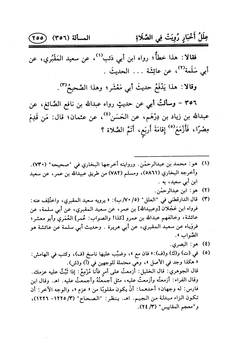 ٣٥٦ - وسألتُ أبي عن حديثٍ رواه عبد الله ابن نافع الصَّائغ، عن عبد الله بْنِ زياد بْن دِرْهَم، عَنِ الحَسَن (٤) ، عَنْ عُثْمَانَ؛ قَالَ: مَن قَدِمَ مِصْرًا، فَأَزْمَعَ (٥) إِقامَةَ أَربَعٍ، أَتَمَّ الصَّلاة؟