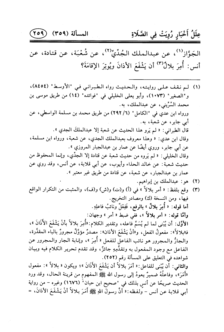 والثاني: أن يُبْنى للفاعل: «أمَرَ بلالا أن يَشْفَعَ الأَذَانَ» ؛ ويكون «بلالاً» : مفعول «أَمَرَ» ، وفاعلُهُ ضميرٌ يعودُ إلى رسول الله (ص) المفهومِ من قرينة الحال، وقد ورد الحديث صريحًا عن أنسٍ بذلك في "صحيح ابن حبان" (١٦٧٦) وغيره - من رواية أبي قلابة عن أنس - ولفظه: «أنَّ رسولَ اللهِ (ص) أَمَرَ بلالا أنْ يَشْفَعَ الأذانَ، ويُوتِرَ الإقامة» . وانظر في رجوع الضمير إلى المفهوم من قرينة السياق، وإنْ لم يَجْرِ له ذِكْرٌ: التعليق على المسألة رقم (٤٠٠) .