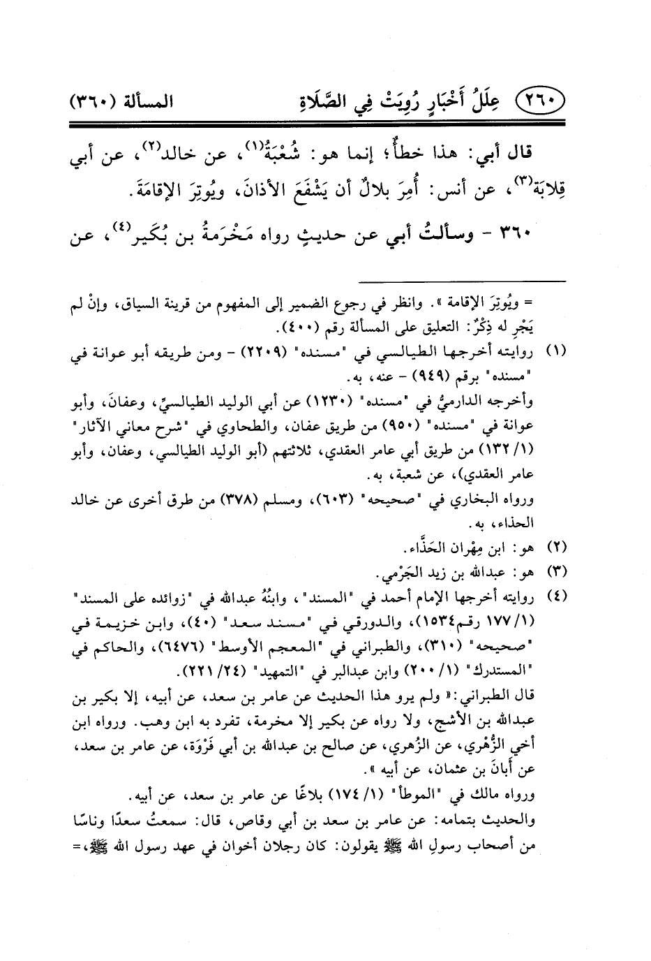 قَالَ أَبِي: هَذَا خطأٌ؛ إِنَّمَا هُوَ: شُعْبَةُ (١) ، عَنْ خَالِدٍ (٢) ، عَنْ أَبِي قِلابَة (٣) ، عَنْ أَنَسٍ: أُمِرَ بلالٌ أَنْ يَشْفَعَ الأذانَ، ويُوتِرَ الإقامَةَ.