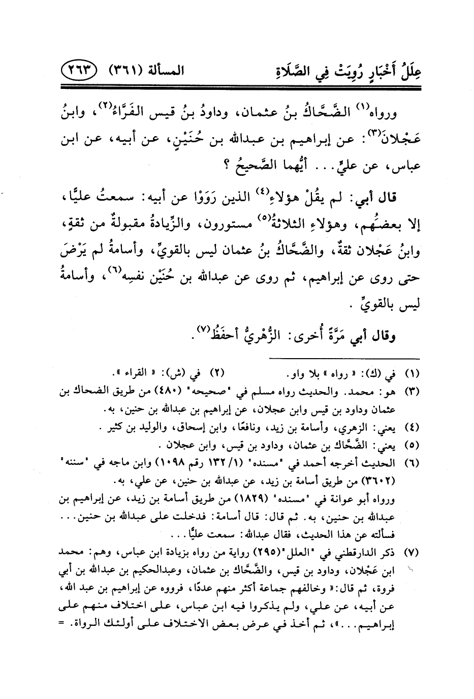 قَالَ أَبِي: لم يقُلْ هؤلاءِ (٤) الذين رَوَوْا عَنْ أَبِيهِ: سمعتُ عليًّا، إلا بعضَ ُهم، وهؤلاءِ الثلاثةُ (٥) مستورون، والزِّيادةُ مقبولةٌ من ثقةٍ، وابنُ عَجْلان ثقةٌ، والضَّحَّاكُ بنُ عُثْمَانَ لَيْسَ بالقويِّ، وأسامةُ لم يَرْضَ حَتَّى روى عَنْ إِبْرَاهِيمَ، ثُمَّ روى عَنْ عبد الله بْنِ حُنَيْن نفسِه (٦) ، وأسامةُ لَيْسَ بالقويِّ.