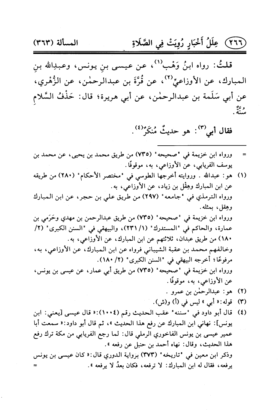 (٤) قال أبو داود في "سننه" عقب الحديث رقم (١٠٠٤) : «قال عيسى [يعني: ابن يونس] : نهاني ابن المبارك عن رفع هذا الحديث» ، ثم قال أبو داود: «سمعت أبا عمير عيسى بن يونس الفاخوري الرملي قال: لما رجع الفريابي من مكة ترك رفع هذا الحديث، وقال: نهاه أحمد بن حنبل عن رفعه» .