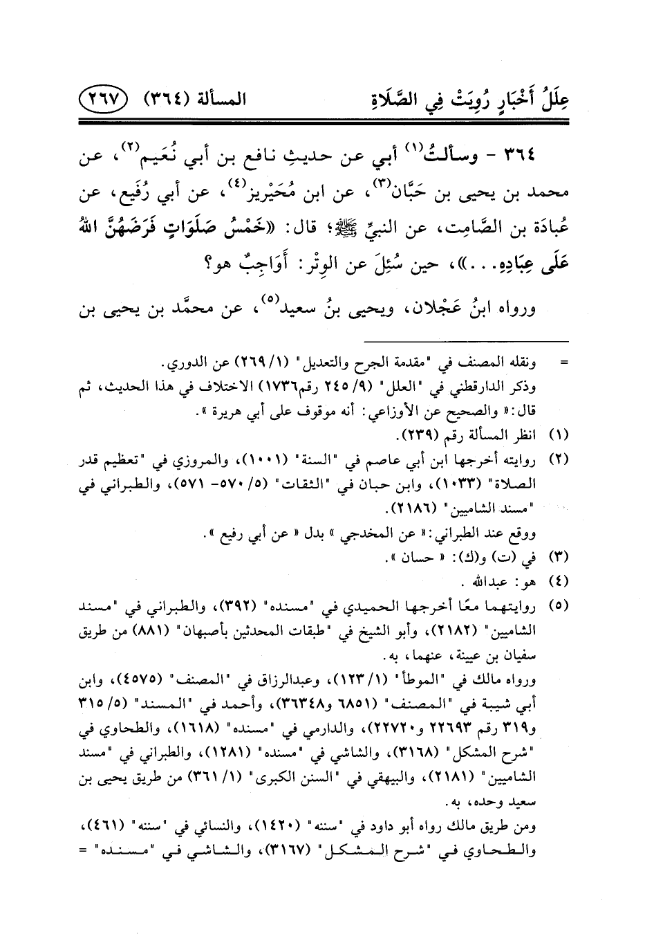 ٣٦٤ - وسألتُ (١) أَبِي عَنْ حديثِ نَافِعِ بْنِ أَبِي نُعَيم (٢) ، عَنْ مُحَمَّدِ بْنِ يَحْيَى بْنِ حَبَّان (٣) ، عَنِ ابْنِ مُحَيْريز (٤) ، عَنْ أَبِي رُفَيْع، عَنْ عُبَادَة بْنِ الصَّامِت، عَنِ النبيِّ (ص) ؛ قَالَ: خَمْسُ صَلَوَاتٍ فَرَضَهُنَّ اللهُ عَلَى عِبَادِهِ ... ، حِين سُئِلَ عَنِ الوِتْر: أَوَاجِبٌ هُوَ؟