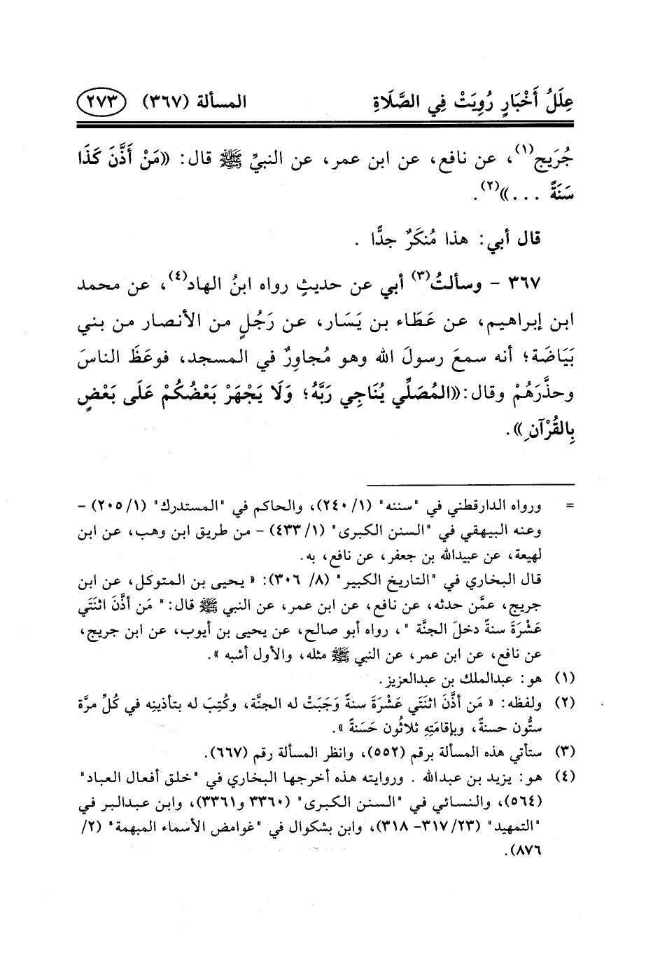 ٣٦٧ - وسألتُ (٣) أَبِي عَنْ حديثٍ رَوَاهُ ابنُ الْهَادِ (٤) ، عَنْ مُحَمَّدِ بْنِ إِبْرَاهِيمَ، عَنْ عَطَاء بْنِ يَسَار، عَنْ رَجُلٍ مِنَ الأَنْصَارِ مِنْ بَنِي بَيَاضَة؛ أَنَّهُ سمعَ رسولَ الله وَهُوَ مُجاوِرٌ فِي الْمَسْجِدِ، فوعَظَ الناسَ وحذَّرَهُمْ وَقَالَ: المُصَلِّي يُنَاجِي رَبَّهُ؛ وَلَا يَجْهَرْ بَعْضُكُمْ عَلَى بَعْضٍ بِالقُرْآن ِ.