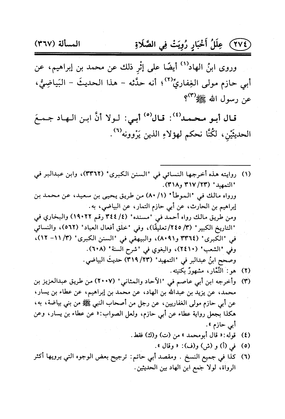 قَالَ أَبُو مُحَمَّدٍ (٤) : قَالَ (٥) أَبِي: لَوْلا أنَّ ابْنَ الْهَادِ جمعَ الحديثَيْنِ، لكُنَّا نَحْكُمُ لهؤلاءِ الَّذِينَ يَرْوونه (٦) .