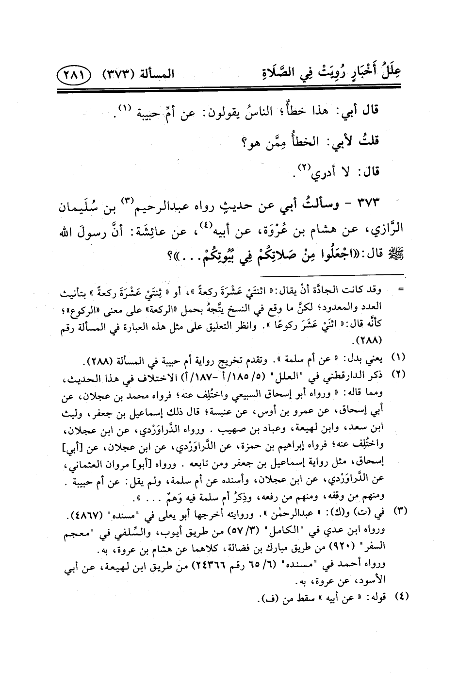 ٣٧٣ - وسألتُ أبي عن حديثٍ رواه عبد الرحيم (٣) بن سُلَيمان الرَّازي، عَنْ هِشَامِ بْنِ عُرْوَة، عَنْ أَبِيهِ (٤) ، عَنْ عائِشَة: أنَّ رسولَ الله (ص) قَالَ: اجْعَلُوا مِنْ صَلاتِكُمْ فِي بُيُوتِكُمْ ... ؟