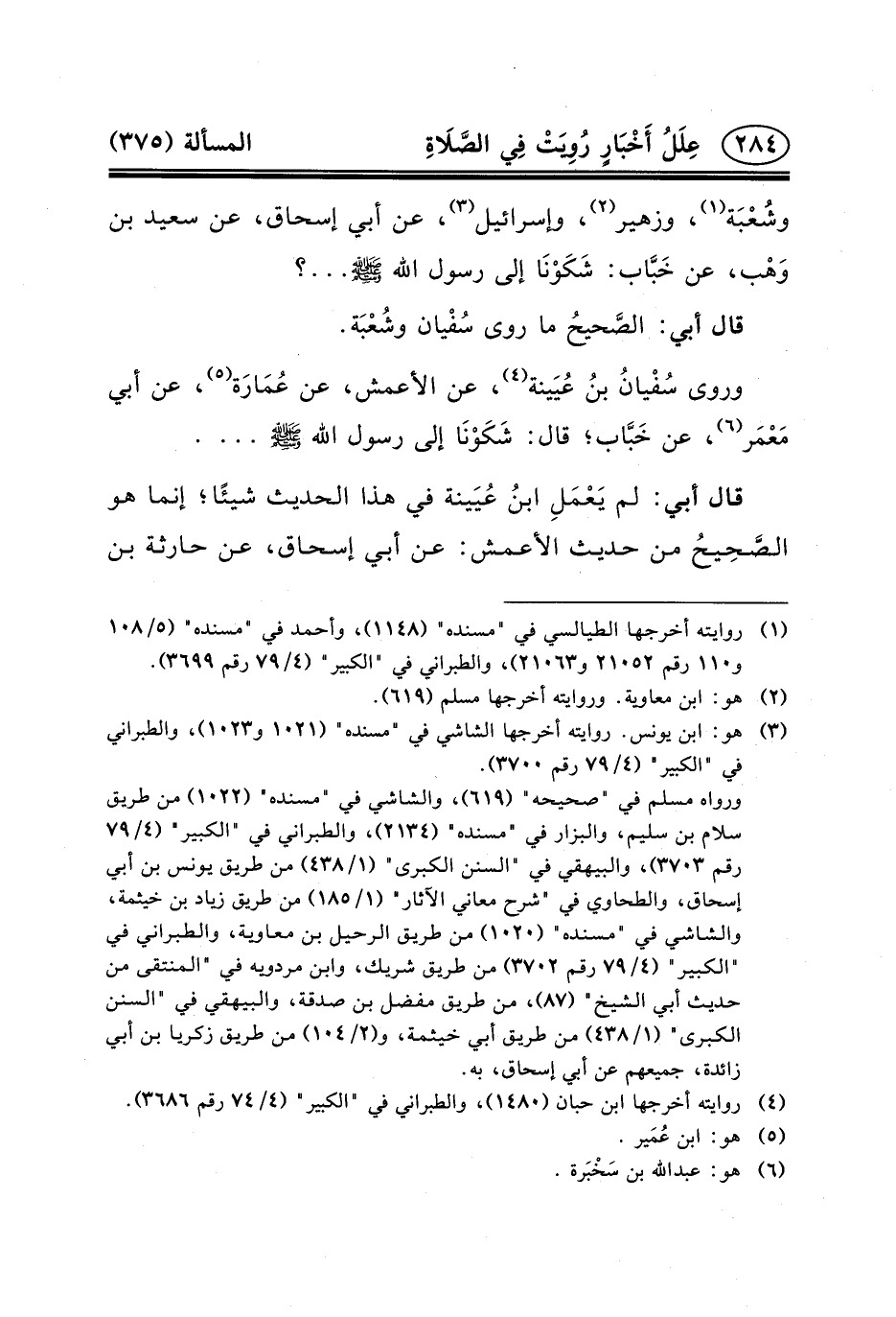 وَرَوَاهُ سُفْيان (١) ، وشُعْبَة (٢) ، وَزُهَيْرٌ (٣) ، وَإِسْرَائِيلُ (٤) ، عَنْ أَبِي إِسْحَاقَ، عَنْ سَعِيدِ بْنِ وَهْب، عَنْ خَبَّاب: شَكَوْنَا إلى رسول الله (ص) ... ؟