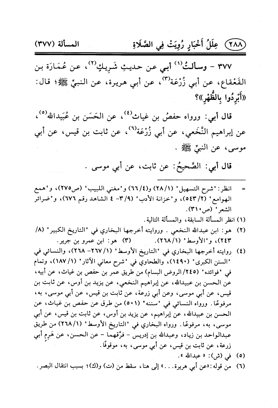 ٣٧٧ - وسألتُ (١) أَبِي عَنْ حديثِ شَرِيكٍ (٢) ، عَنْ عُمَارَة بْنِ القَعْقاع، عَنْ أَبِي زُرْعَة (٣) ، عَنْ أَبِي هُرَيْرَةَ، عن النبيِّ (ص) ؛ قَالَ: أَبْرِدُوا بِالظُّهْرِ؟