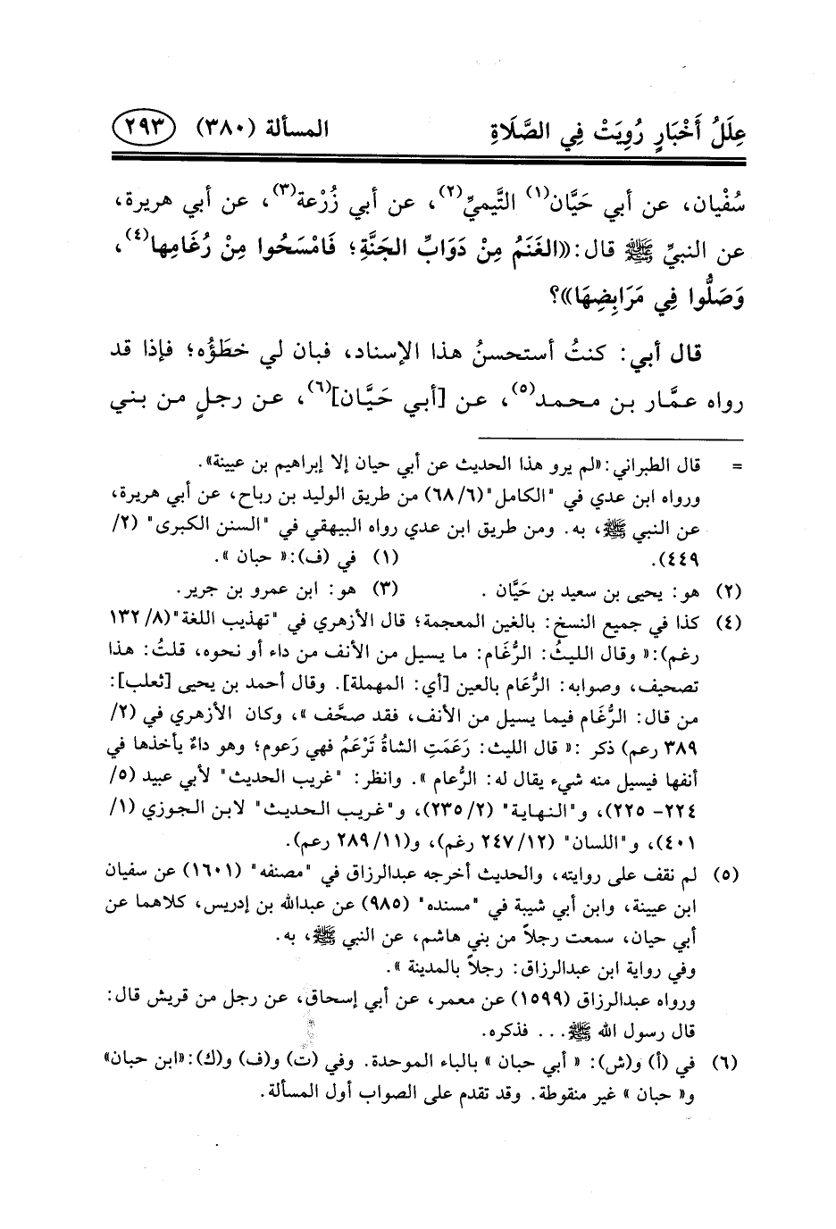 سُفْيان، عَنْ أَبِي حَيَّان (١) التَّيميِّ (٢) ، عَنْ أَبِي زُرْعة (٣) ، عَنْ أَبِي هريرة، عن النبيِّ (ص) قَالَ: الغَنَمُ مِنْ دَوَابِّ الجَنَّةِ؛ فَامْسَحُوا مِنْ رُغَامِها (٤) ، وَصَلُّوا فِي مَرَابِضِهَا؟