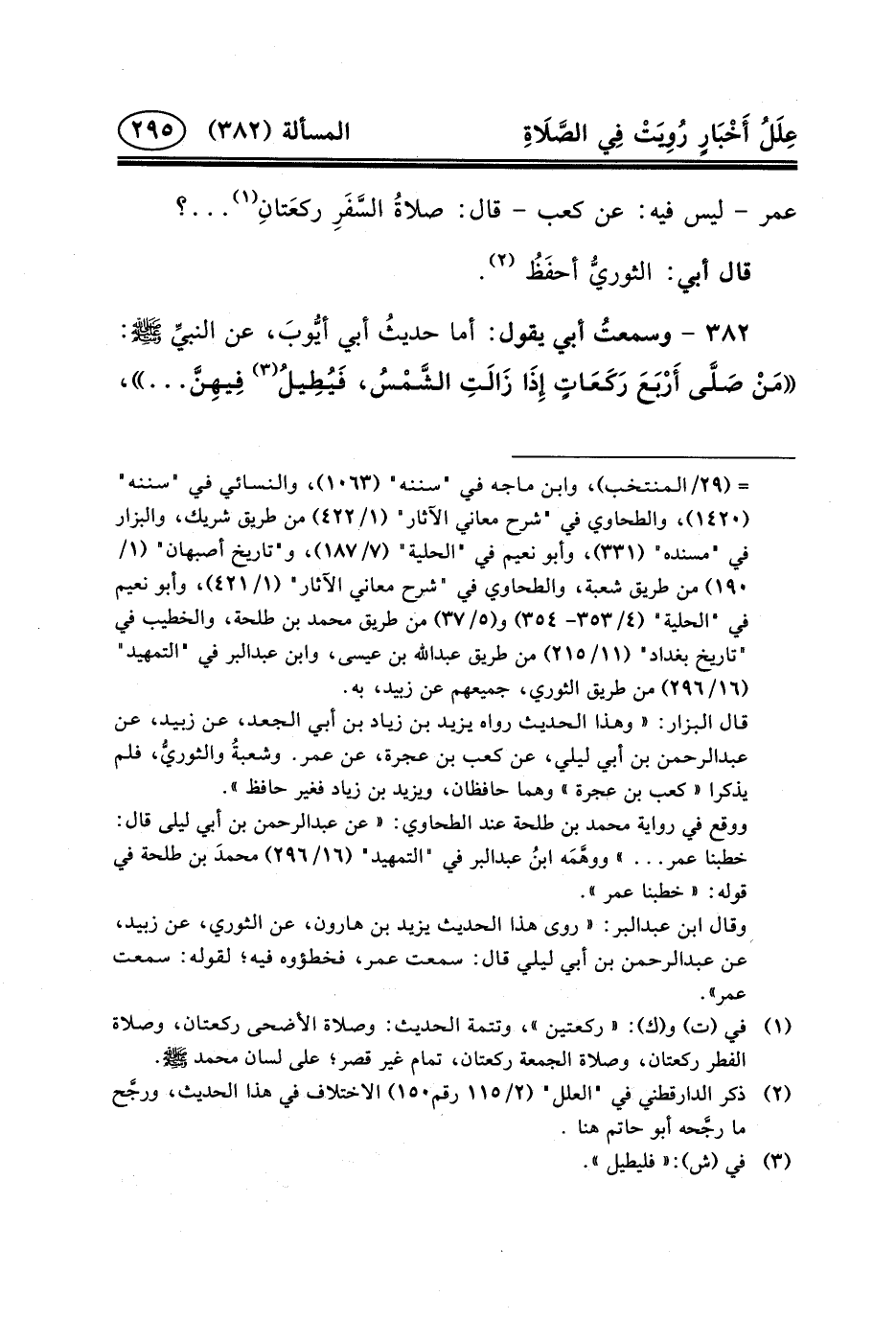 ٣٨٢ - وسمعتُ أَبِي يَقُولُ: أَمَّا حديثُ أبي أيُّوبَ، عن النبيِّ (ص) : مَنْ صَلَّى أَرْبَعَ رَكَعَاتٍ إِذَا زَالَتِ الشَّمْسُ، فَيُطِيلُ (٣) فِيهِنَّ ... ،
