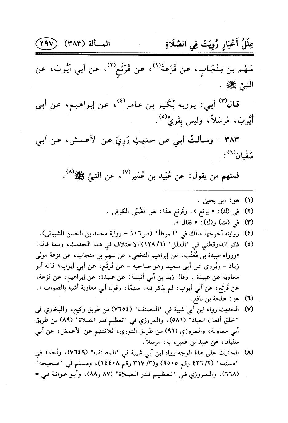 (٧) الحديث رواه ابن أبي شيبة في "المصنف" (٧٦٥٤) من طريق وكيع، والبخاري في "خلق أفعال العباد" (٥٨١) ، والمروزي في "تعظيم قدر الصلاة" (٨٩) من طريق أبي معاوية، والمروزي (٩١) من طريق الثوري، ثلاثتهم عَنِ الأَعْمَشِ، عَنْ أَبِي سُفْيَانَ، عن عبيد بن عمير، به، مرسلاً.