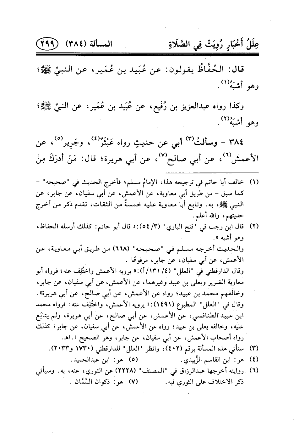 ٣٨٤ - وسألتُ (٣) أَبِي عَنْ حديثٍ رَوَاهُ عَبْثَرٌ (٤) ، وجَرِير (٥) ، عَنِ الأَعْمَشِ (٦) ، عَنْ أَبِي صَالِحٍ (٧) ، عَنْ أَبِي هُرَيْرَةَ؛ قَالَ: مَنْ أدرَكَ مِنْ