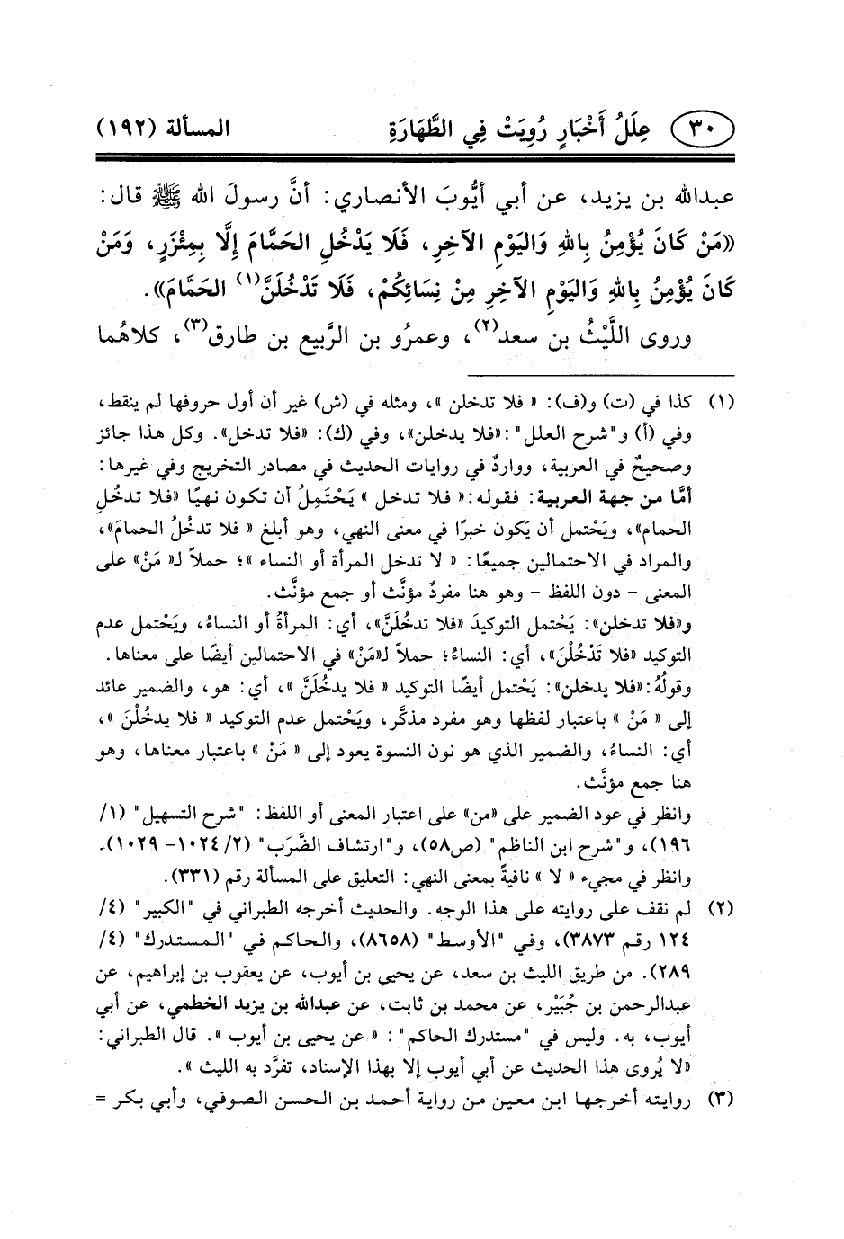 عَبْدِ اللَّهِ بْنِ يَزِيدَ، عَنْ أَبِي أيُّوبَ الأَنْصَارِيَّ: أنَّ رسولَ الله (ص) قَالَ: مَنْ كَانَ يُؤْمِنُ بِاللهِ وَاليَوْمِ الآخِرِ، فَلَا يَدْخُلِ الحَمَّامَ إِلَاّ بِمِئْزَرٍ، وَمَنْ كَانَ يُؤْمِنُ بِاللهِ وَاليَوْمِ الآخِرِ مِنْ نِسَائِكُمْ، فَلَا تَدْخُلَنَّ (١) الحَمَّامَ.
