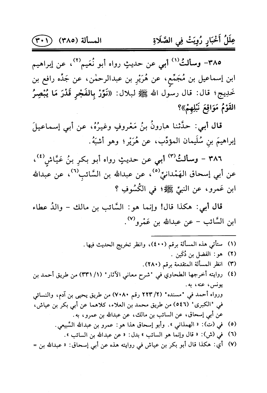 ٣٨٦ - وسألتُ (٣) أَبِي عَنْ حديثٍ رَوَاهُ أَبُو بكرِ بنُ عَيَّاشٍ (٤) ، عَنْ أَبِي إِسْحَاقَ الهَمْدانيِّ (٥) ، عَنْ عبد الله بن السَّائبِ (٦) ، عن عبد الله بن عَمرو، عن النبيِّ (ص) ؛ فِي الكُسُوفِ؟