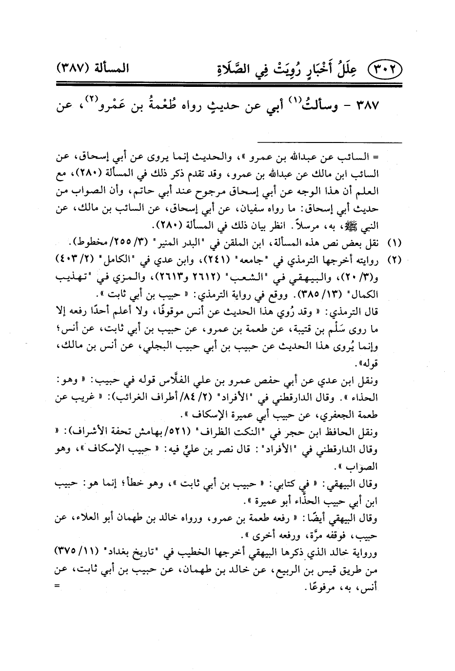 ٣٨٧ - وسألتُ (١) أَبِي عَنْ حديثٍ رَوَاهُ طُعْمةُ بن عَمْرو (٢) ،