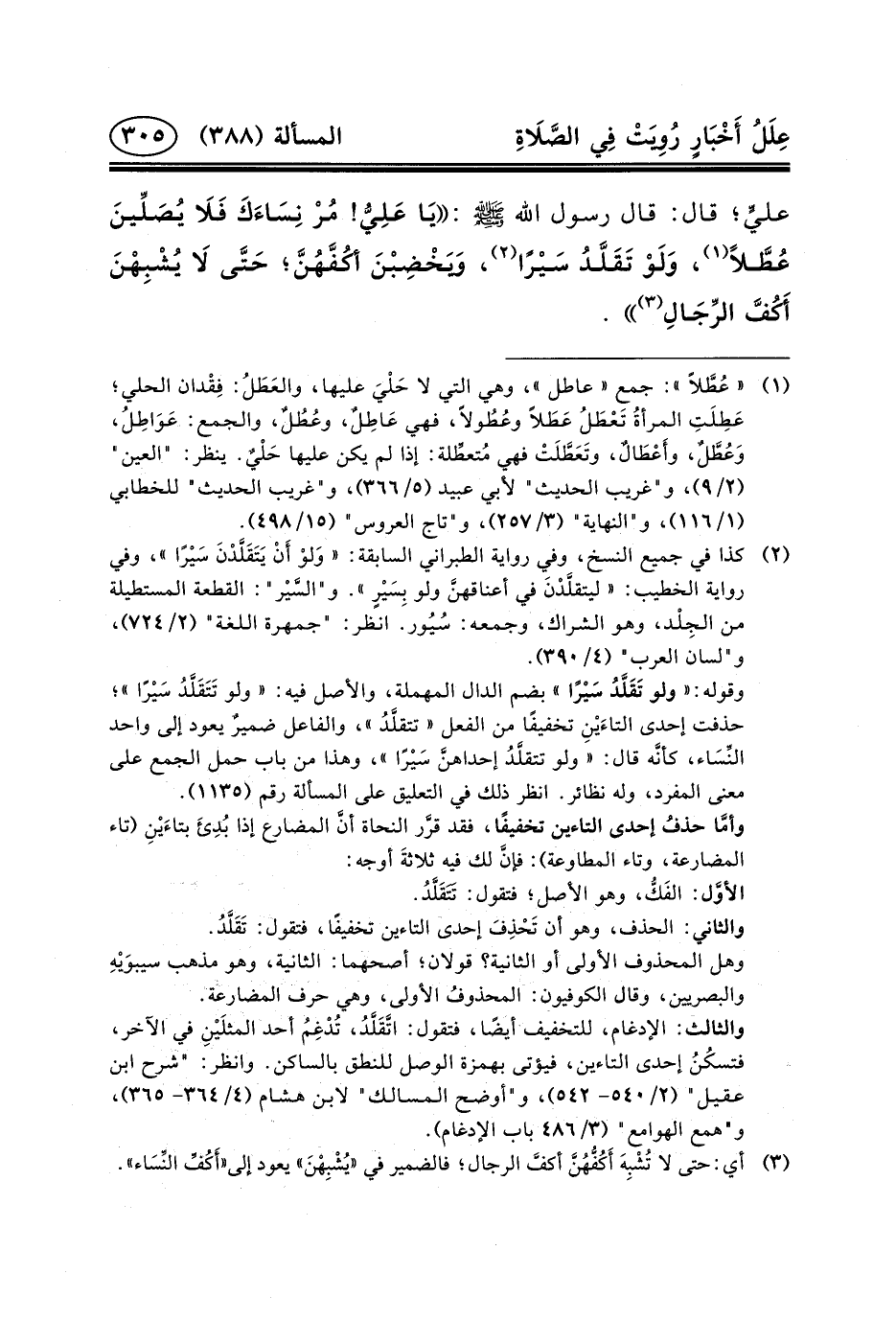عليٍّ؛ قَالَ: قَالَ رَسُولُ اللَّهِ (ص) : يَا عَلِيُّ! مُرْ نِسَاءَكَ فَلَا يُصَلِّينَ عُطَّلاً (١) ، وَلَوْ تَقَلَّدُ سَيْرًا (٢) ،
