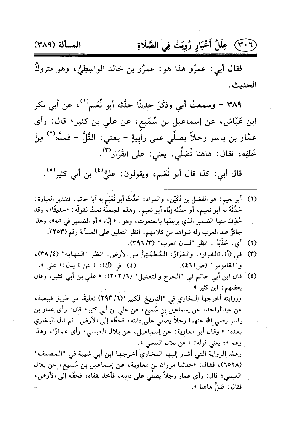 ٣٨٩ - وسمعتُ أَبِي وذكَرَ حَدِيثًا حدَّثه أَبُو نُعَيم (١) ، عَنْ أَبِي بَكْرِ بْنِ عَيَّاش، عَن إِسْمَاعِيلَ بْنِ سُمَيعٍ، عَنْ عَلِيِّ بْنِ كثير؛ قَالَ: رَأَى عمَّار بْن ياسر رجلا يصلِّي عَلَى رابِيةٍ - يعني: التَّلَّ - فمدَّه (٢) مِنْ خَلفِه، فَقَالَ: هاهنا تُصَلِّي. يعني: عَلَى القَرَار (٣) .