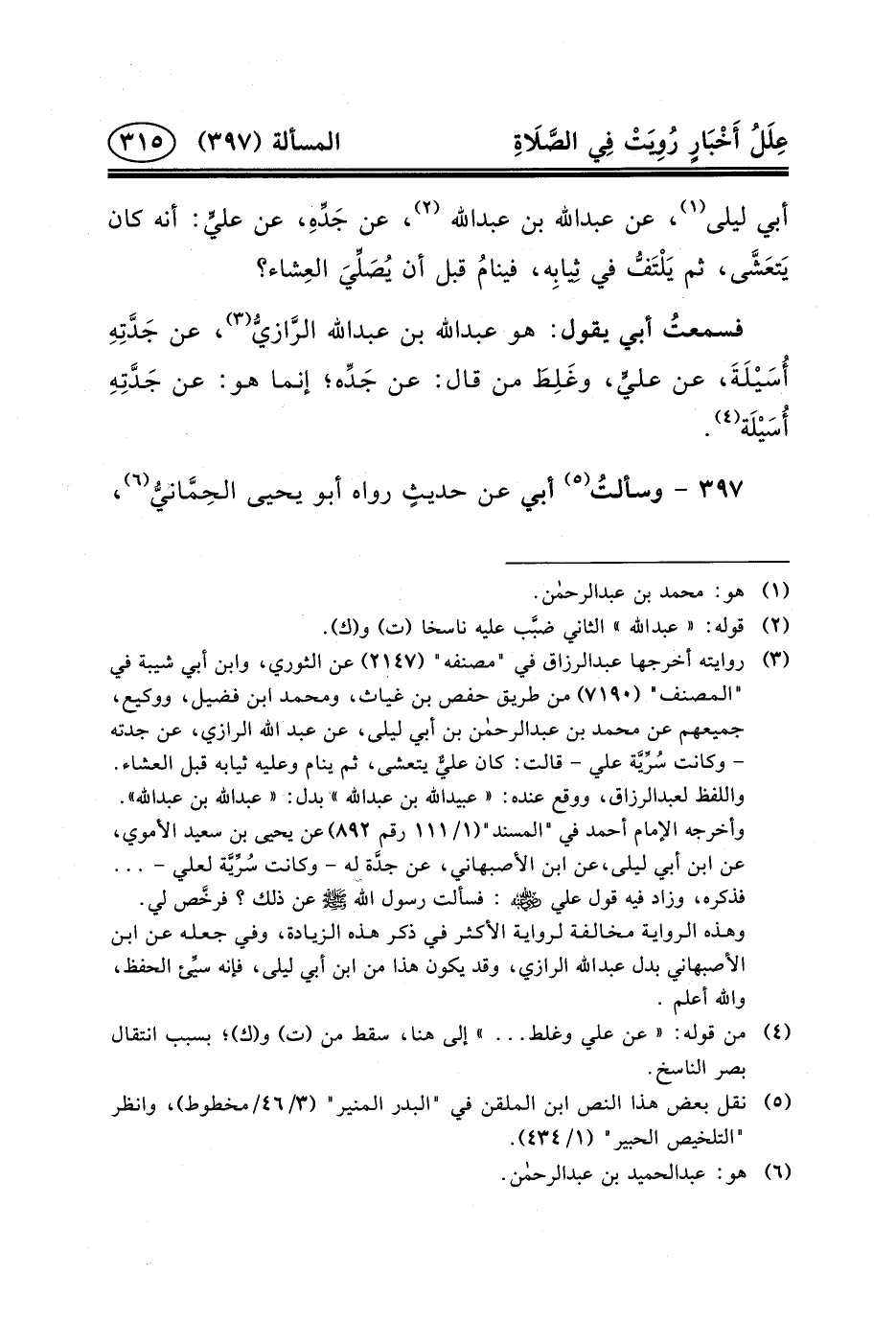 (٣) روايته أخرجها عبد الرزاق في "مصنفه" (٢١٤٧) عن الثوري، وابن أبي شيبة في "المصنف" (٧١٩٠) من طريق حفص بن غياث، ومحمد بن فضيل، ووكيع، جميعهم عن محمد بن عبد الرحمن بْنِ أَبِي لَيْلَى، عَنْ عَبْدِ الله الرازي، عن جدته - وكانت سُرِّيَّة علي - قالت: كان عليٌّ يتعشى، ثم ينام وعليه ثيابه قبل العشاء. واللفظ لعبد الرزاق، ووقع عنده: «عبيد الله بن عبد الله» بدل: «عبد الله بن عبد الله» .