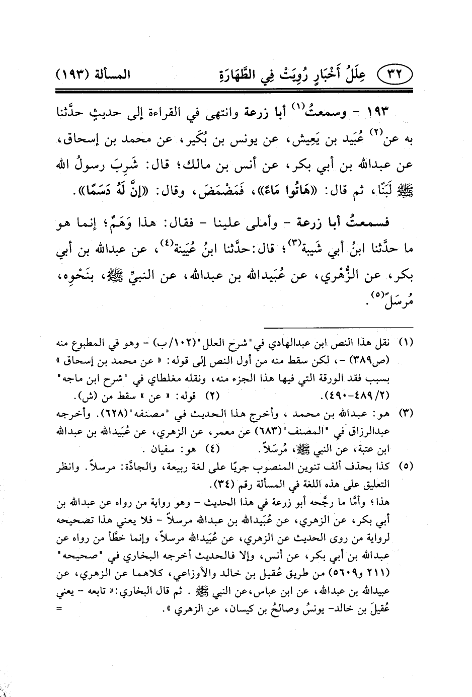 ١٩٣ - وسمعتُ (١) أَبَا زُرْعَةَ وَانْتَهَى فِي الْقِرَاءَةِ إِلَى حديثٍ حدَّثنا بِهِ عَنْ (٢) عُبَيد بْنِ يَعِيش، عَنْ يُونُسَ بْنِ بُكَير، عَنْ مُحَمَّدِ بن إسحاق، عن عبد الله بْنِ أَبِي بَكْرٍ، عَنْ أَنَسِ بْنِ مَالِكٍ؛ قَالَ: شَرِبَ رسولُ الله (ص) لَبَنًا، ثُمَّ قَالَ: هَاتُوا مَاءً، فَمَضْمَضَ، وَقَالَ: إنَّ لَهُ دَسَمًا.