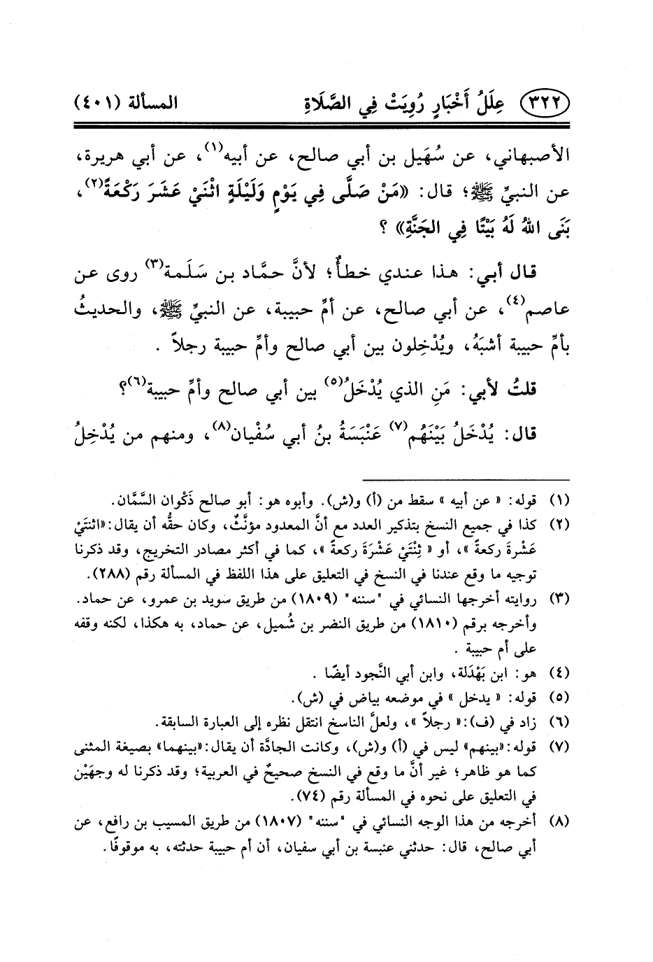 قَالَ أَبِي: هَذَا عِنْدِي خطأٌ؛ لأنَّ حمَّاد بْنَ سَلَمة (٣) رَوَى عَنْ عَاصِمٍ (٤) ، عَنْ أَبِي صَالِحٍ، عَنْ أمِّ حَبِيبَةَ، عن النبيِّ (ص) ، والحديثُ بأمِّ حَبِيبَةَ أشبَهُ، ويُدْخِلون بَيْنَ أَبِي صَالِحٍ وأمِّ حَبِيبَةَ رَجُلا.