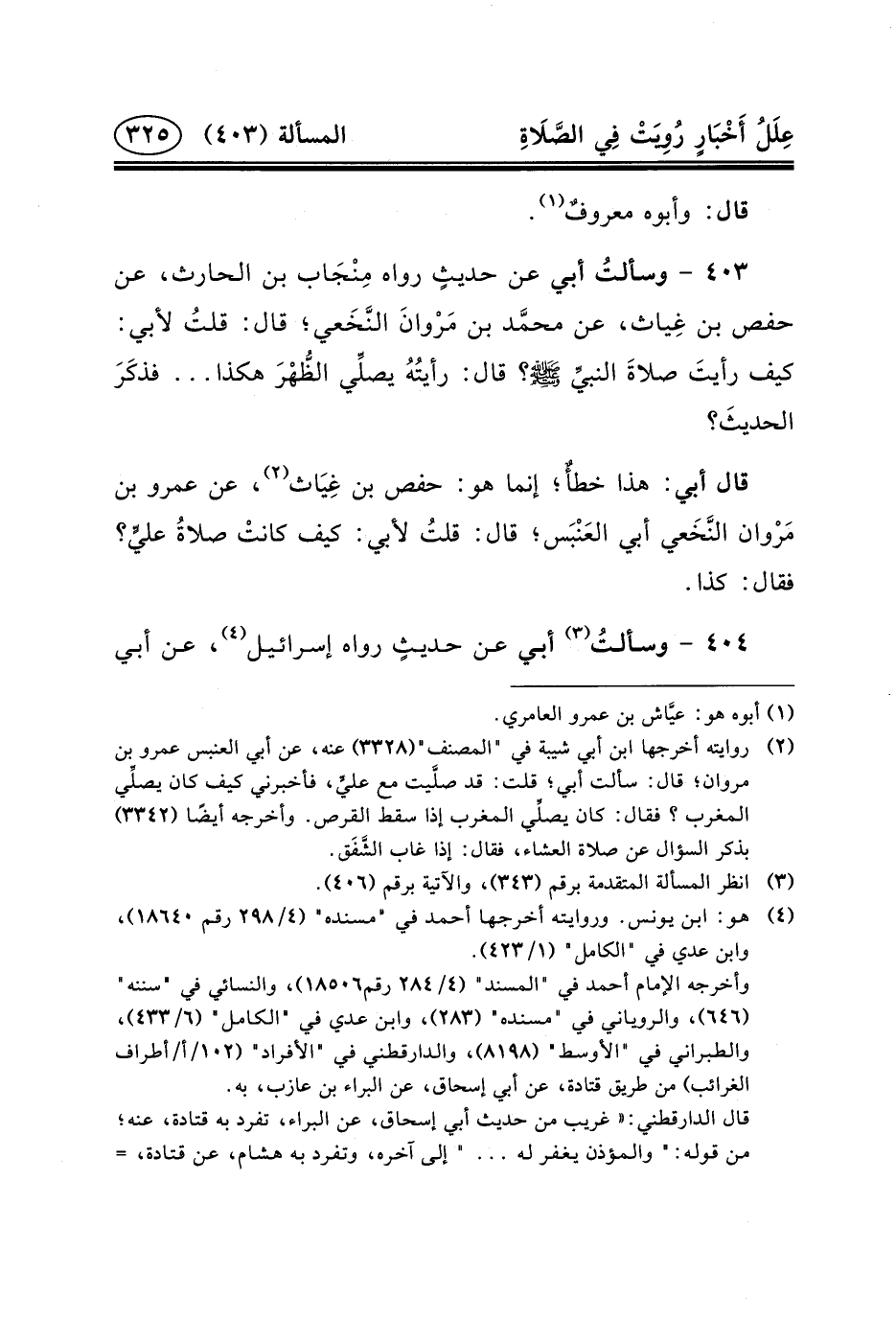 ٤٠٣ - وسألتُ أَبِي عَنْ حديثٍ رَوَاهُ مِنْجَاب بْن الْحَارِثِ، عَنْ حَفْصِ بْنِ غِياث، عَنْ محمَّد بْنِ مَرْوانَ النَّخَعي؛ قَالَ: قلتُ لأَبِي: كيف رأيتَ صلاةَ النبيِّ (ص) ؟ قَالَ: رأيتُهُ يصلِّي الظُّهْرَ هَكَذَا ... فذكَرَ الحديثَ؟