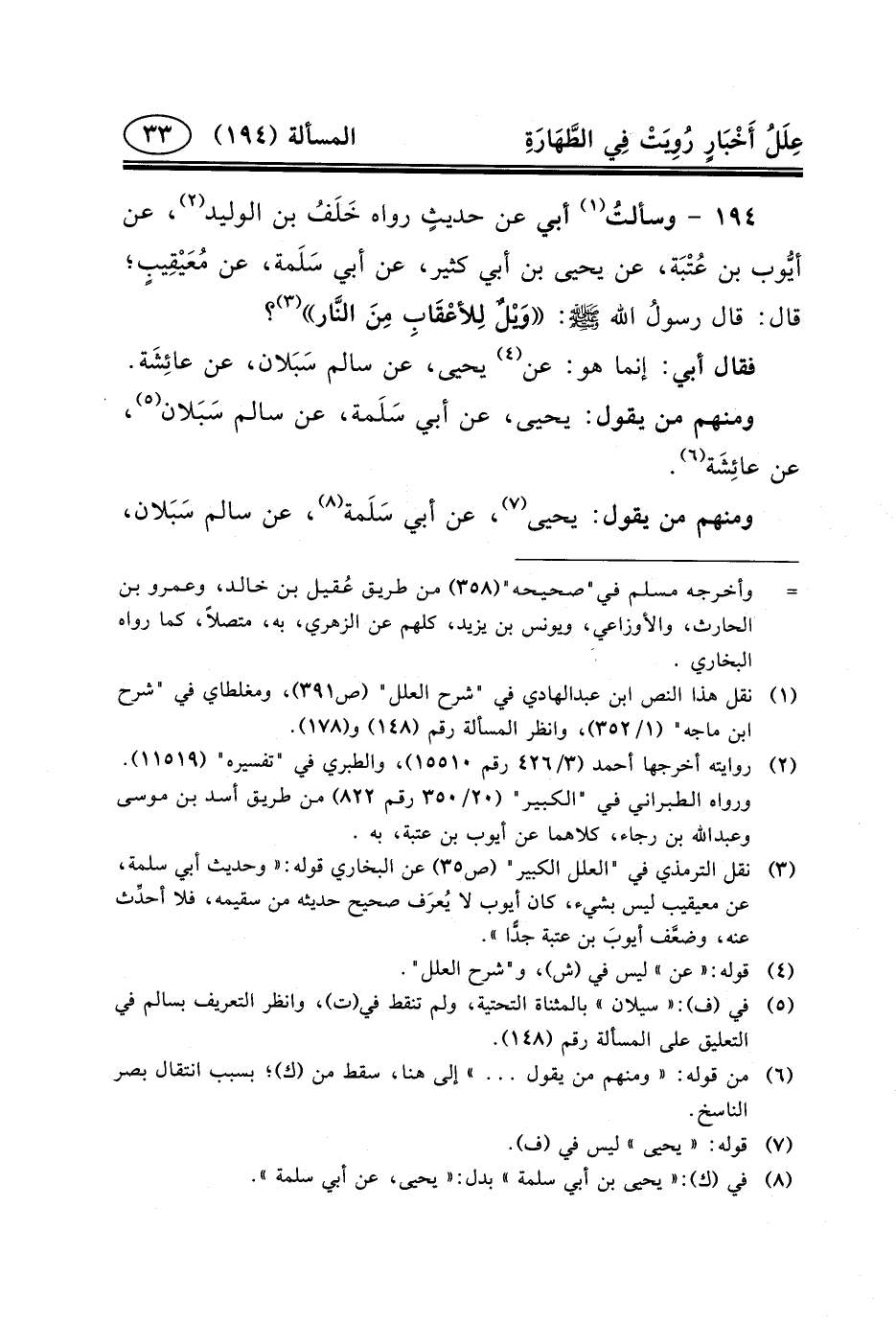 ١٩٤ - وسألتُ (١) أَبِي عَنْ حديثٍ رَوَاهُ خَلَفُ بْنُ الْوَلِيدِ (٢) ، عَنْ أيُّوب بْنِ عُتْبَة، عَنْ يَحْيَى بْنِ أَبِي كَثِيرٍ، عَنْ أَبِي سَلَمة، عَنْ مُعَيْقِيبٍ؛ قَالَ: قَالَ رسولُ الله (ص) : وَيْلٌ لِلأعْقَابِ مِنَ النَّار (٣) ؟
