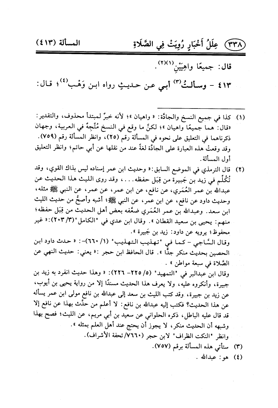 (١) كذا في جميع النسخ والجادَّة: «واهيان» ؛ لأنه خبرٌ لمبتدأ محذوف، والتقدير: «قال: هما جميعًا واهيان» ؛ لكنَّ ما وقع في النسخ مُتَّجِهٌ في العربية، وجهان ذكرناهما في التعليق على نحوه في المسألة رقم (٢٥) ، وانظر المسألة رقم (٧٥٩) .