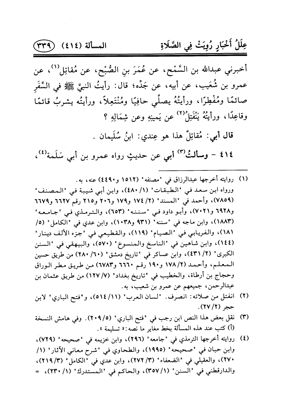 ٤١٤ - وسألتُ (٣) أَبِي عَنْ حديثٍ رَوَاهُ عَمْرُو بْنُ أَبِي سَلَمة (٤) ،