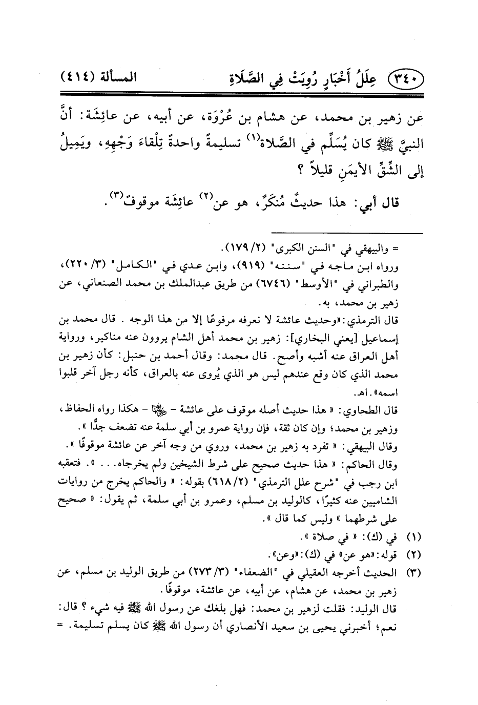 (٣) الحديث أخرجه العقيلي في "الضعفاء" (٣/٢٧٣) من طريق الوليد بن مسلم، عَنْ زُهَيْرِ بْنِ مُحَمَّدٍ، عَنْ هِشَامٍ، عَنْ أَبِيهِ، عَنْ عَائِشَةَ، موقوفًا.