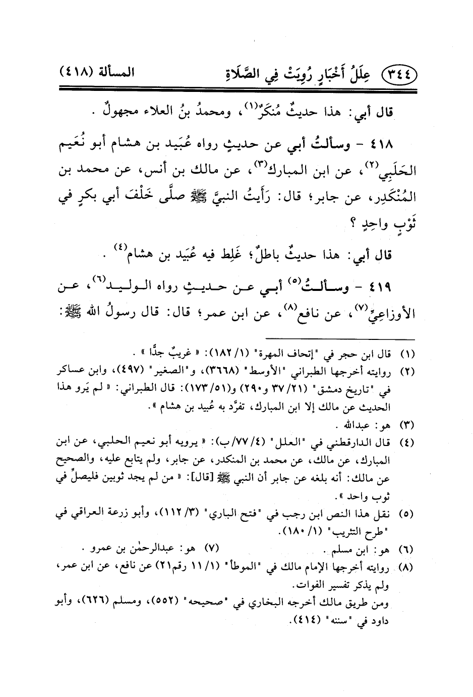 ٤١٨ - وسألتُ أَبِي عَنْ حديثٍ رواه عُبَيد ابن هِشَامٍ أَبُو نُعَيم الحَلَبِي (٢) ، عَنِ ابْنِ الْمُبَارَكِ (٣) ، عَنْ مَالِكِ بْنِ أَنَسٍ، عَنْ مُحَمَّدِ بْنِ المُنْكَدِر، عَنْ جَابِرٍ؛ قَالَ: رَأَيتُ النبيَّ (ص) صلَّى خَلْفَ أَبِي بكرٍ فِي ثَوْبٍ واحِدٍ؟
