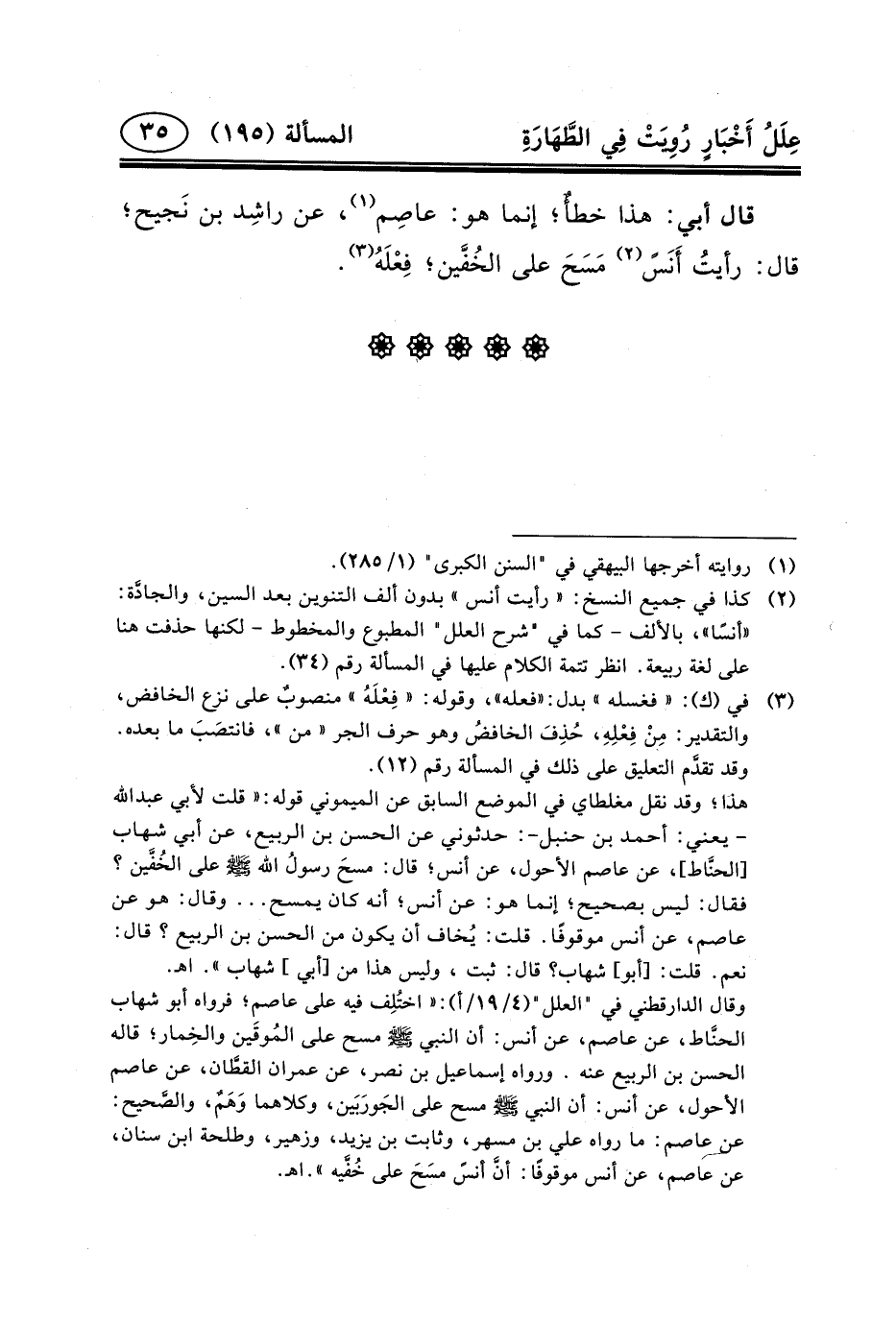 قَالَ أَبِي: هَذَا خطأٌ؛ إِنَّمَا هُوَ: عاصِم (١) ، عَن راشِد بْن نَجيح؛ قال: رأيتُ أَنَسً (٢) مَسَحَ على الخُفَّين؛ فِعْلَهُ (٣) .