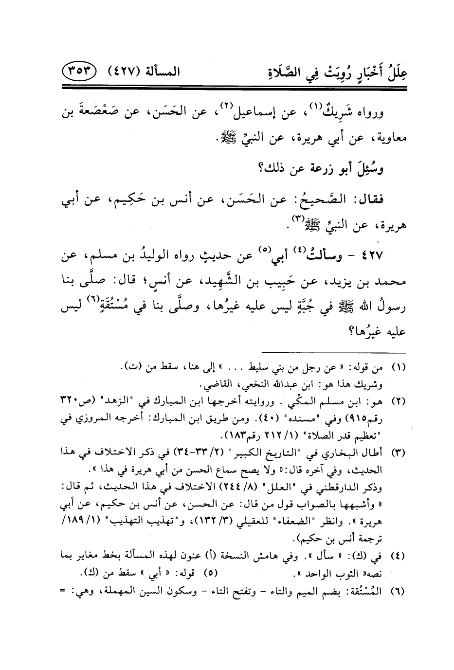 ٤٢٧ - وسألتُ (٤) أَبِي (٥) عَنْ حديثٍ رَوَاهُ الوليدُ بْنُ مُسْلِمٍ، عَنْ مُحَمَّدِ بْنِ يَزِيدَ، عَنْ حَبِيب بْنِ الشَّهِيد، عَنْ أنسٍ؛ قَالَ: صلَّى بنا رسولُ الله (ص) فِي جُبَّةٍ لَيْسَ عَلَيْهِ غيرُها، وصلَّى بِنَا فِي مُسْتُقَةٍ (٦) لَيْسَ عليه غيرُها؟