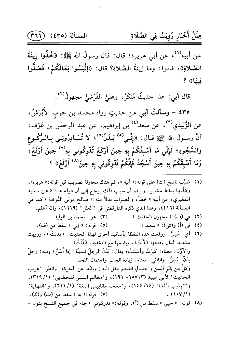 ٤٣٥ - وسألتُ أَبِي عَنْ حديثٍ رَوَاهُ محمد ابن حربٍ الأَبْرَشُ، عَنِ الزُّبَيدي (٣) ، عَنْ سَعْدِ (٤) بْنِ إِبْرَاهِيمَ، عَنْ عَبْدِ الرَّحْمَنِ بْنِ عَوْف: أنَّ رسولَ الله (ص) قَالَ: إِنِّي (٥) بَدَنٌ (٦) ؛ لا تُبَادِرُونِي بِالرُّكُوعِ والسُّجُودِ؛ فَإِنِّي مَا أَسْبِقْكُمْ بِهِ حِينَ أَرْكَعُ تُدْرِكُوني بِهِ (٧) حِينَ أَرْفَعُ، وَمَا أَسْبِقْكُمْ بِهِ حِينَ أَسْجُدُ فَإِنَّكُمْ تُدْرِكُوني بِهِ حِينَ (٨)
