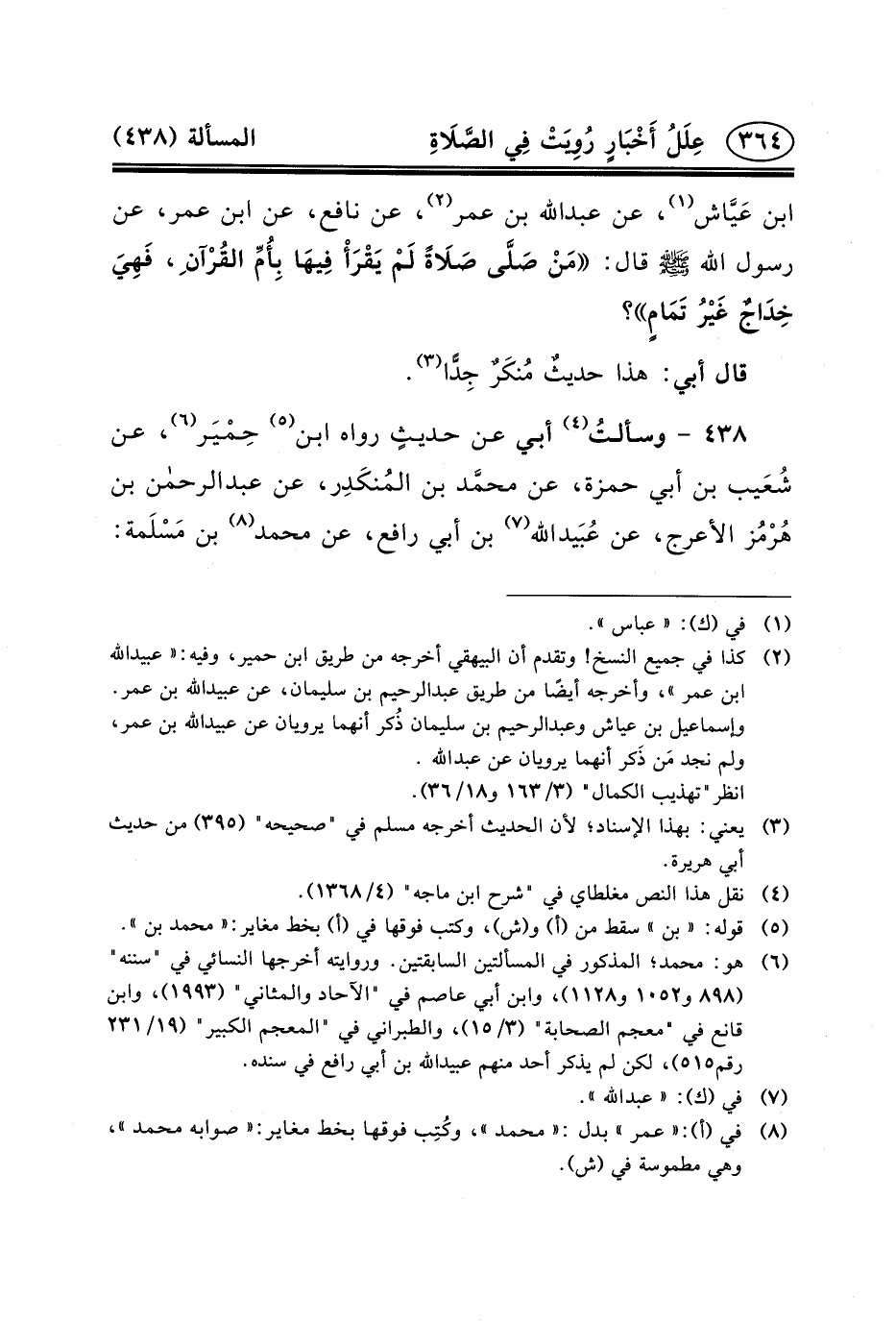 ٤٣٨ - وسألتُ (٤) أَبِي عَنْ حديثٍ رَوَاهُ ابْنُ (٥) حِمْيَر (٦) ، عَنْ شُعَيب بْنِ أَبِي حَمْزَة، عَنْ محمَّد بْنِ المُنكَدِر، عن عبد الرحمن بن هُرْمُز الأعرج، عن عُبَيدالله (٧) بْنِ أَبِي رَافِعٍ، عَنْ مُحَمَّدِ (٨) بن مَسْلَمة: