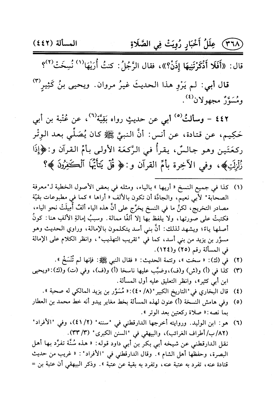 ٤٤٢ - وسألتُ (٥) أَبِي عَنْ حديثٍ رَوَاهُ بَقِيَّة (٦) ، عَنْ عُتْبة بْنِ أَبِي حَكِيم، عَنْ قَتَادَةَ، عَنْ أَنَسٍ: أنَّ النبيَّ (ص) كَانَ يُصَلِّي بَعْدَ الوِتْر ركعَتَين وَهُوَ جالسٌ، يقرأُ فِي الرَّكعَة الأُولَى بأمِّ الْقُرْآنِ وَ: {إِذَا زُلْزِلَتِ الأَْرْضُ زِلْزَالَهَا *} ، وَفِي الآخِرة بأمِّ الْقُرْآنِ وَ: {قُلْ يَاأَيُّهَا الْكَافِرُونَ *} ؟