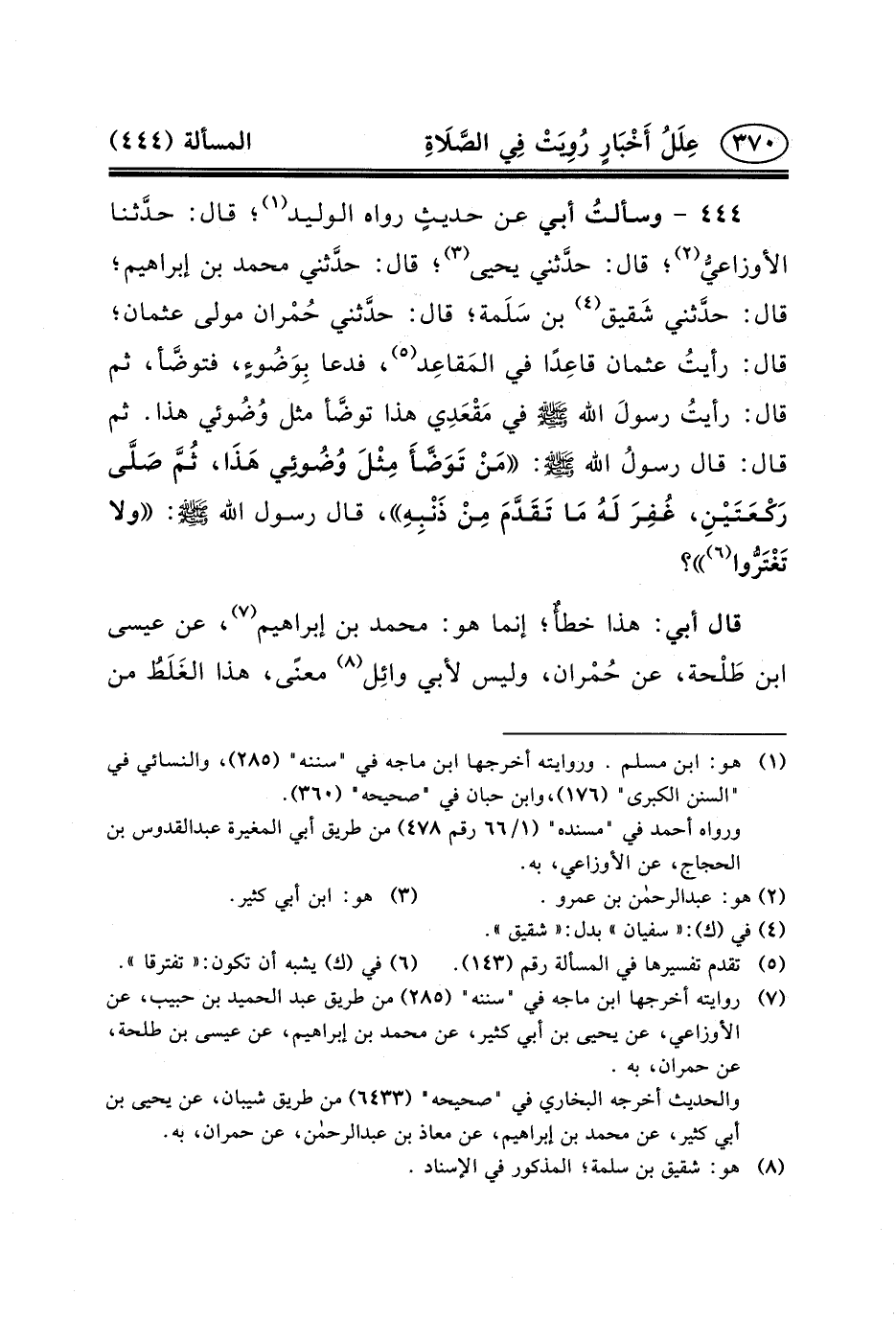 ٤٤٤ - وسألتُ أَبِي عَنْ حديثٍ رَوَاهُ الْوَلِيدُ (١) ؛ قَالَ: حدَّثنا الأوزاعيُّ (٢) ؛ قَالَ: حدَّثني يَحْيَى (٣) ؛ قَالَ: حدَّثني مُحَمَّدُ بْنُ إِبْرَاهِيمَ؛ قَالَ: حدَّثني شَقيق (٤) بْنُ سَلَمة؛ قَالَ: حدَّثني حُمْران مَوْلَى عُثْمَانَ؛ قَالَ: رأيتُ عُثْمَانَ قاعِدًا فِي المَقاعِد (٥) ، فَدَعَا بِوَضُوءٍ، فتوضَّأ، ثُمَّ قَالَ: رأيتُ رسولَ الله (ص) فِي مَقْعَدِي هَذَا توضَّأ مِثْلَ وُضُوئي هَذَا. ثُمَّ قَالَ: قَالَ رسولُ الله (ص) : مَنْ تَوَضَّأَ مِثْلَ وُضُوئِي هَذَا، ثُمَّ صَلَّى رَكْعَتَيْنِ، غُفِرَ لَهُ مَا تَقَدَّمَ مِنْ ذَنْبِهِ، قَالَ رسول الله (ص) : وَلا تَغْتَرُّوا (٦) ؟