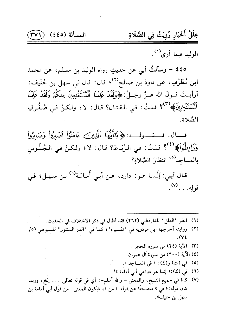 ٤٤٥ - وسألتُ أَبِي عن حديثٍ رواه الوليد ابن مُسْلِمٍ، عَنْ مُحَمَّدِ بْنِ مُطَرِّفٍ، عن داودَ ابن صَالِحٍ (٢) ؛ قَالَ: قَالَ لي سهل بْن حُنَيف: أرأيتَ قولَ اللَّهِ عزَّ وجلَّ: {وَلَقَدْ عَلِمْنَا الْمُسْتَقْدِمِينَ مِنْكُمْ وَلَقَدْ عَلِمْنَا الْمُسْتَأْخِرِينَ *} (٣) ؟ قلتُ: فِي القتال؟ قَالَ: لا؛ ولكنْ فِي صُفُوفِ الصَّلاة.
