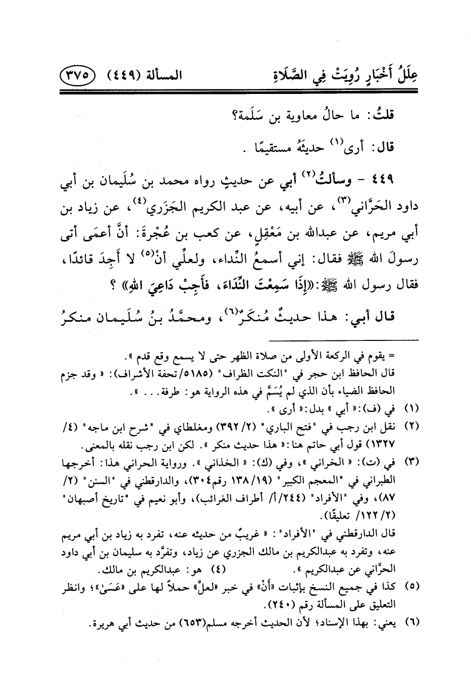 ٤٤٩ - وسألتُ (٢) أَبِي عَنْ حديثٍ رَوَاهُ مُحَمَّد بْن سُلَيمان بْن أَبِي دَاوُدَ الحَرَّاني (٣) ، عَنْ أَبِيهِ، عَنْ عَبْدِ الْكَرِيمِ الجَزَري (٤) ، عَنْ زِيَادِ ابن أبي مريم، عن عبد الله بن مَعْقِلٍ، عن كعب ابن عُجْرةَ: أنَّ أعمَى أَتَى رسولَ الله (ص) فَقَالَ: إِنِّي أسمعُ النِّداء، ولعلِّي أنْ (٥) لا أَجِدَ قَائِدًا، فَقَالَ رسول الله (ص) : إِذَا سَمِعْتَ النِّدَاءَ، فأَجِبْ دَاعِيَ اللهِ؟