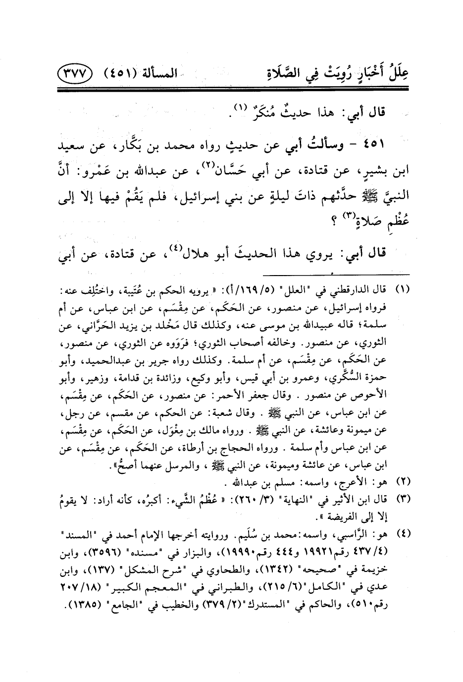 ٤٥١ - وسألتُ أَبِي عَنْ حديثٍ رَوَاهُ محمد ابن بَكَّار، عَنْ سَعِيدِ بْنِ بشيرٍ، عَنْ قَتَادَةَ، عَنْ أَبِي حَسَّان (٢) ، عن عبد الله بن عَمْرو: أنَّ النبيَّ (ص) حدَّثهم ذاتَ ليلةٍ عَن بني إسرائيل، فلم يَقُمْ فِيهَا إِلا إلَى عُظْمِ صَلاةٍ (٣) ؟